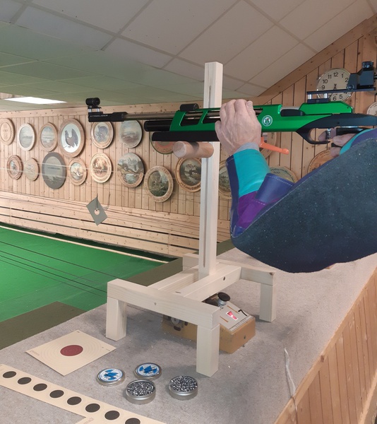 Mit kurzer Stange für sitzend Schießende ist alles nur 60 cm lang. (siehe